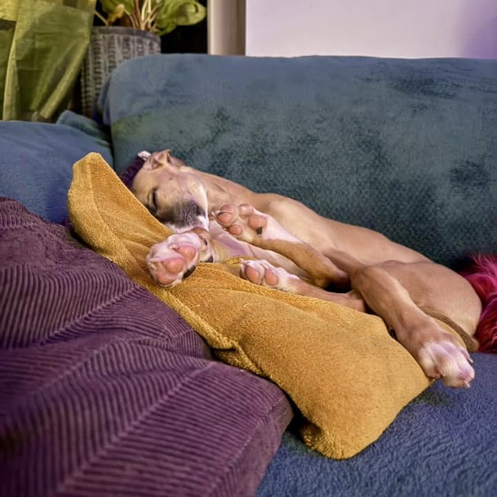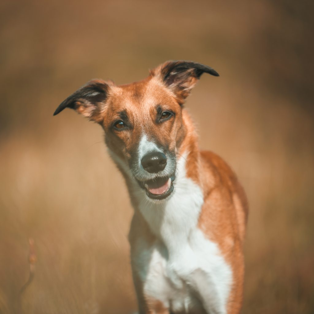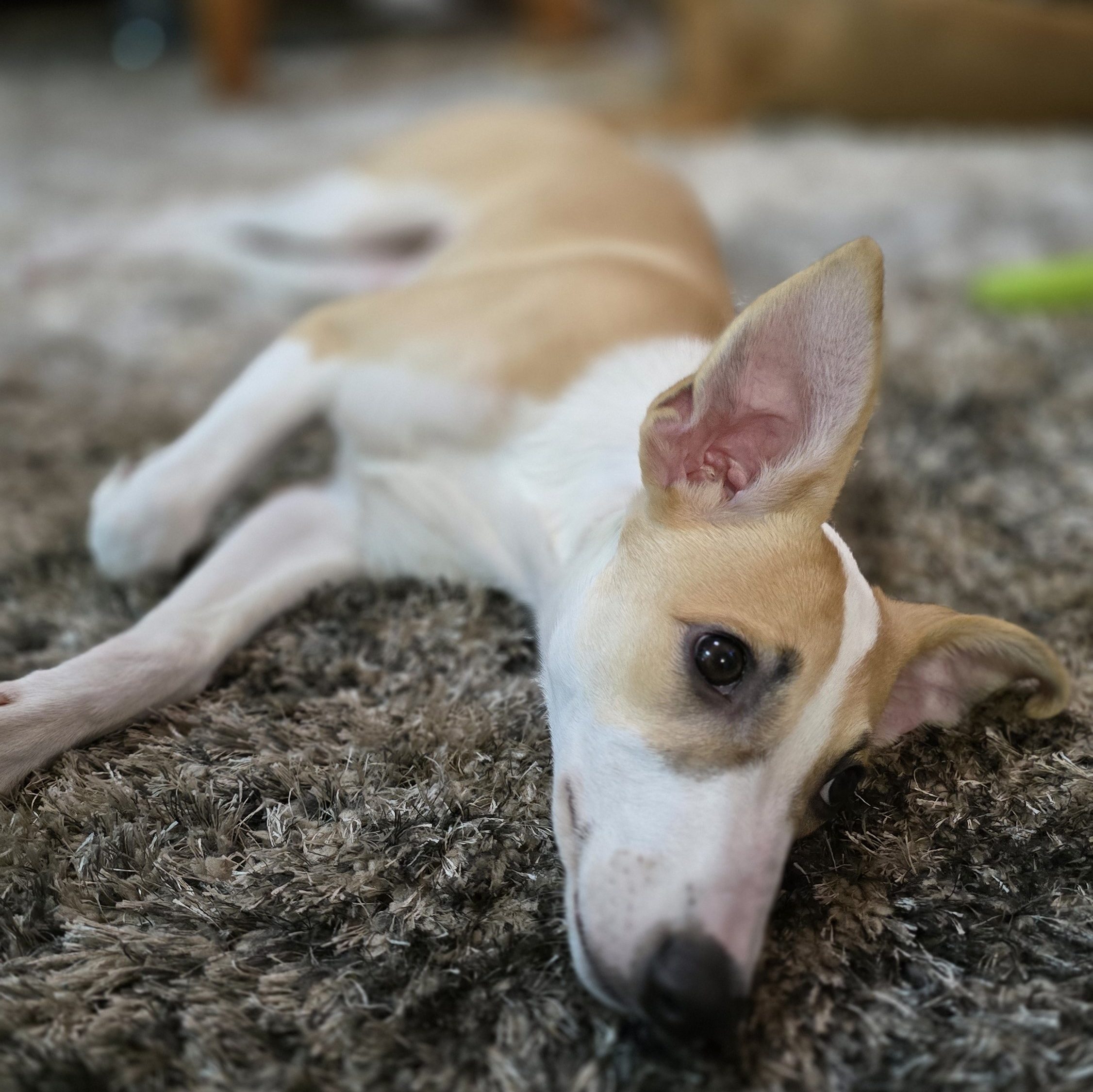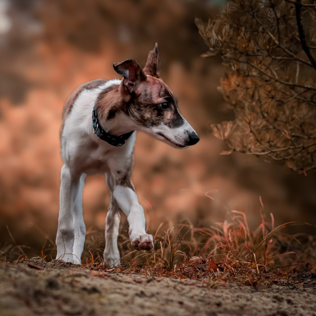 Border whippet przypominający biało-rudego lisa, a z pyszczka staffika. Córeczka tatusia wdała się w ojca, gardzi kołderką, preferuje zimną podłogę. Zawzięta z niej sucz, ale i przesłodka.